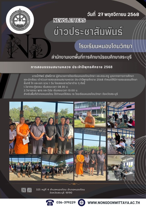 วันที่ 27 พฤศจิกายน 2568 นางน้ำทิพย์ สุโพธิ์ภาค ผู้อำนวยการโรงเรียนหนองโดนวิทยา และคณะครู บุคลากรทางการศึกษา และนักเรียน เข้าร่วมการสอบธรรมสนามหลวง ประจำปีพุทธศักราช 2568 กำหนดให้มีการสอบธรรมศึกษาชั้นตรี โท และเอก รวม 1 วัน โดยสอบรายวิชาต่าง ๆ ดังนี้ 1.วิ