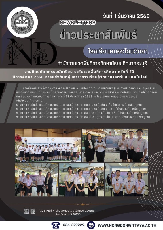 วันที่ 1 ธันวาคม 2568 นางน้ำทิพย์ สุโพธิ์ภาค ผู้อำนวยการโรงเรียนหนองโดนวิทยา มอบหมายให้ครูประภาพร ศรีคง และ ครูภัทรมน เหลาจินดาวัฒน์ นำนักเรียนเข้าร่วมการแข่งขันกลุ่มสาระการเรียนรู้วิทยาศาสตร์และเทคโนโลยี งานศิลปหัตถกรรมนักเรียน ระดับเขตพื้นที่การศึกษา คร