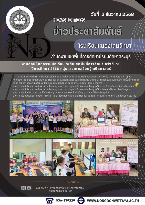 วันที่ 2 ธันวาคม 2568 นางน้ำทิพย์ สุโพธิ์ภาค ผู้อำนวยการโรงเรียนหนองโดนวิทยา มอบหมายให้คณะครูนำนักเรียนเข้าร่วมการแข่งขันกลุ่มสาระการเรียนรู้คณิตศาสตร์ งานศิลปหัตถกรรมนักเรียน ระดับเขตพื้นที่การศึกษา ครั้งที่ 73 ปีการศึกษา 2568 ณ โรงเรียนมวกเหล็กวิทยา