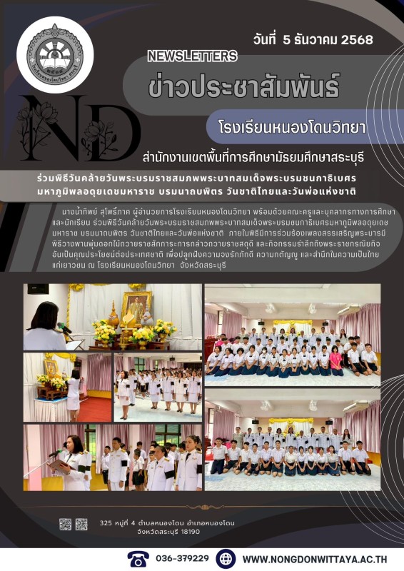 วันที่ 5 ธันวาคม 2568 นางน้ำทิพย์ สุโพธิ์ภาค ผู้อำนวยการโรงเรียนหนองโดนวิทยา พร้อมด้วยคณะครูและบุคลากรทางการศึกษา และนักเรียน ร่วมพิธีวันคล้ายวันพระบรมราชสมภพพระบาทสมเด็จพระบรมชนกาธิเบศรมหาภูมิพลอดุยเดชมหาราช บรมนาถบพิตร วันชาติไทยและวันพ่อแห่งชาติ ภายในพ
