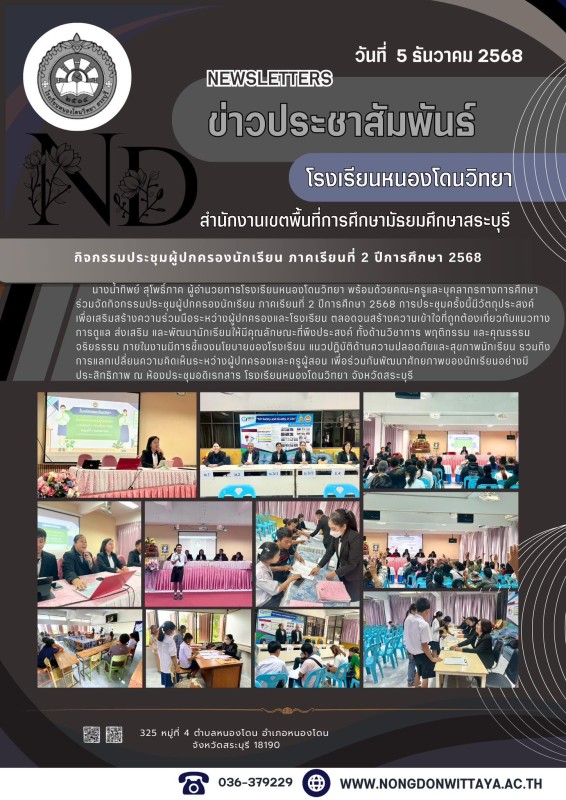 วันที่ 5 ธันวาคม 2568 นางน้ำทิพย์ สุโพธิ์ภาค ผู้อำนวยการโรงเรียนหนองโดนวิทยา พร้อมด้วยคณะครูและบุคลากรทางการศึกษา ร่วมจัดกิจกรรมประชุมผู้ปกครองนักเรียน ภาคเรียนที่ 2 ปีการศึกษา 2568 การประชุมครั้งนี้มีวัตถุประสงค์ เพื่อเสริมสร้างความร่วมมือระหว่างผู้ปกครอ