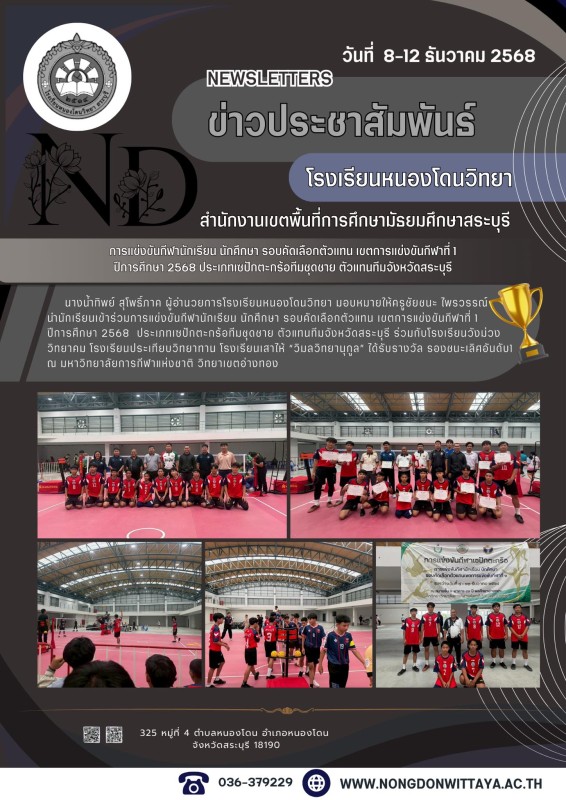 วันที่ 8-12ธันวาคม 2568 นางน้ำทิพย์ สุโพธิ์ภาค ผู้อำนวยการโรงเรียนหนองโดนวิทยา มอบหมายให้ครูชัยชนะ ไพรวรรณ์ นำนักเรียนเข้าร่วมการแข่งขันกีฬานักเรียน นักศึกษา รอบคัดเลือกตัวแทน เขตการแข่งขันกีฬาที่ 1 ปีการศึกษา 2568 ประเภทเซปักตะกร้อทีมชุดชาย ตัวแทนทีมจังห