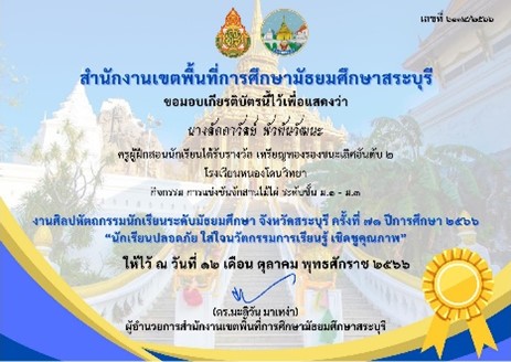ชื่อผลงาน : ครูผู้ฝึกสอนนักเรียนได้รับรางวัล ระดับเหรียญทอง รองชนะเลิศอันดับ 2 การแข่งขันจักสานไม้ไผ่ ระดับชั้น ม.1 - ม.3 งานศิลปหัตถกรรมนักเรียน ระดับมัธยมศึกษา จังหวัดสระบุรี ครั้งที่ 71 ปีการศึกษา 2566