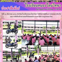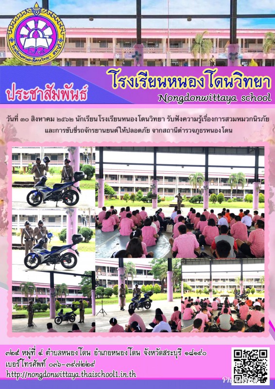 นักเรียนโรงเรียนหนองโดนวิทยารับฟังความรู้เรื่องการสวมหมวกนิรภัยและการขับขี่รถจักรยานยนต์ให้ปลอดภัย