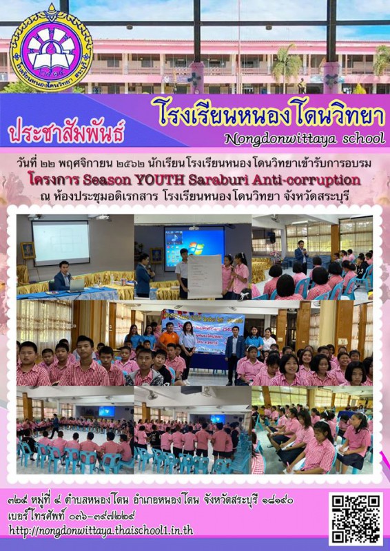 นักเรียนโรงเรียนหนองโดนวิทยาเข้ารับการอบรม โครงการ Season YOUTH Saraburi Anti-corruption