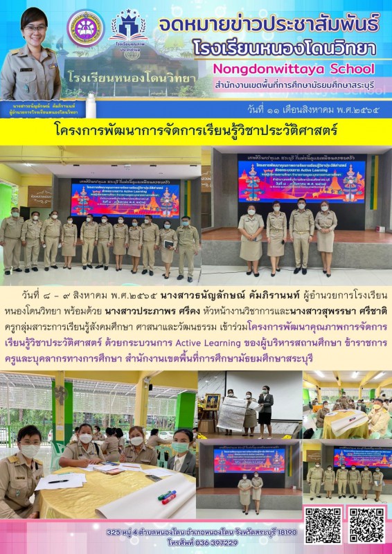 วันที่ ๘ - ๙ สิงหาคม พ.ศ.๒๕๖๕ นางสาวธนัญลักษณ์ คัมภิรานนท์ ผู้อำนวยการโรงเรียนหนองโดนวิทยา พร้อมด้วยครูโรงเรียนหนองโดนวิทยา เข้าร่วมโครงการพัฒนาคุณภาพการจัดการเรียนรู้ด้วยกระบวนการ Active Learning