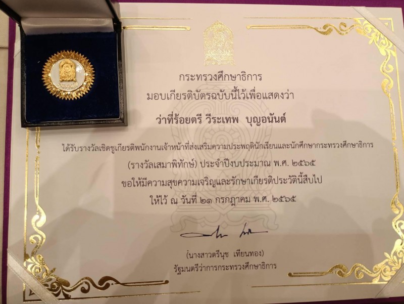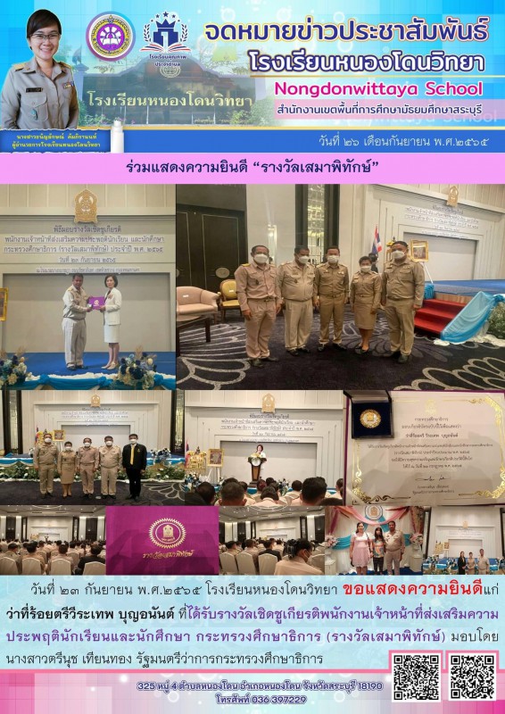 วันที่ ๒๓ กันยายน พ.ศ.๒๕๖๕ โรงเรียนหนองโดนวิทยา ขอแสดงความยินดีแก่ว่าที่ร้อยตรีวีระเทพ บุญอนันต์ ที่ได้รับรางวัลเชิดชูเกียรติพนักงานเจ้าหน้าที่ส่งเสริมความประพฤตินักเรียนและนักศึกษา กระทรวงศึกษาธิการ (รางวัลเสมาพิทักษ์)
