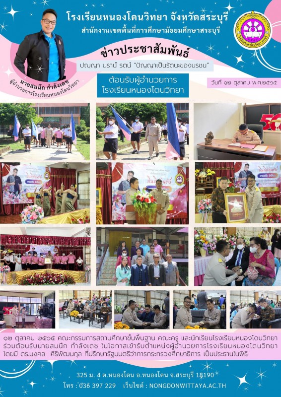 ๑๒ ตุลาคม ๒๕๖๕ คณะกรรมการสถานศึกษาขั้นพื้นฐาน คณะครู และนักเรียนโรงเรียนหนองโดนวิทยา ร่วมต้อนรับนายสมนึก กำลังเดช ในโอกาสเข้ารับตำแหน่งผู้อำนวยการโรงเรียนหนองโดนวิทยา โดยมี ดร.มงคล ศิริพัฒนกุล ที่ปรึกษารัฐมนตรีว่าการกระทรวงศึกษาธิการ เป็นประธานในพิธี