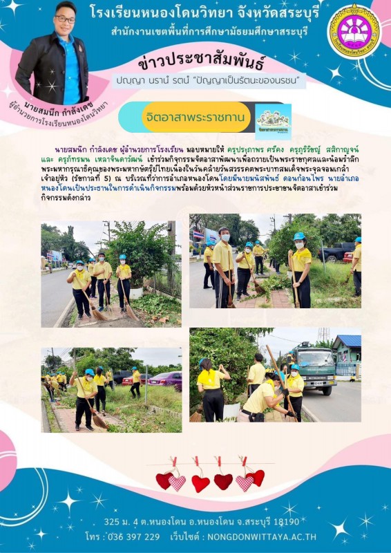 ๒๑ ตุลาคม ๒๕๖๕ นายสมนึก กำลังเดชผู้อำนวยการโรงเรียน มอบหมายให้ผู้แทนคณะครูโรงเรียนหนองโดนวิทยา เข้าร่วมกิจกรรมจิตอาสาพัฒนา เพื่อถวายเป็นพระราชกุศลและน้อมรำลึกพระมหากรุณาธิคุณของพระมหากษัตริย์ไทย ณ บริเวณที่ว่าการอำเภอหนองโดน จังหวัดสระบุรี