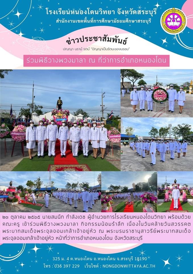 ๒๓ ตุลาคม ๒๕๖๕ นายสมนึก กำลังเดช ผู้อำนวยการโรงเรียนหนองโดนวิทยา พร้อมด้วยคณะครู เข้าร่วมพิธีวางพวงมาลา กิจกรรมน้อมรำลึก เนื่องในวันคล้ายวันสวรรคต พระบาทสมเด็จพระจุลจอมเกล้าเจ้าอยู่หัว ณ พระบรมราชานุสาวรีย์พระบาทสมเด็จพระจุลจอมเกล้าเจ้าอยู่หัว