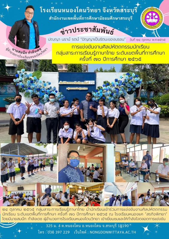 ๒๔ ตุลาคม ๒๕๖๕ กลุ่มสาระการเรียนรู้ภาษาไทย นำนักเรียนเข้าร่วมการแข่งขันงานศิลปหัตถกรรมนักเรียน ระดับเขตพื้นที่การศึกษา ครั้งที่ ๗๐ ณ โรงเรียนหนองแค “สรกิจพิทยา”โดยมีนายสมนึก กำลังเดช ผู้อำนวยการโรงเรียนหนองโดนวิทยา เข้าเยี่ยมชมและให้กำลังใจตลอดการแข่งขัน