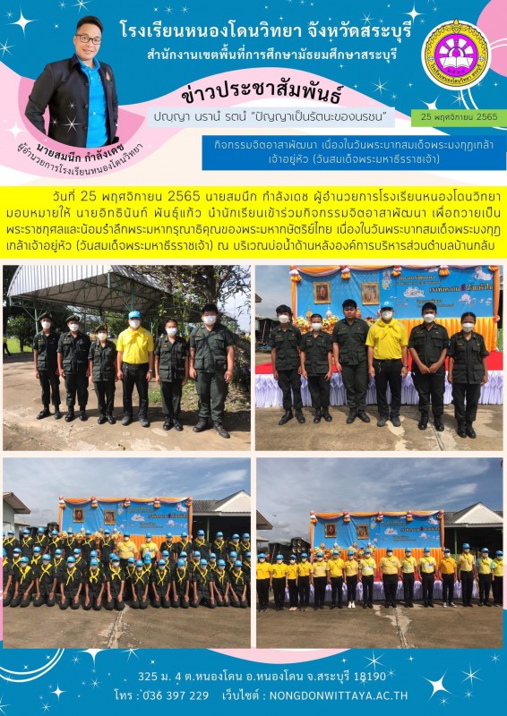 25 พฤศจิกายน 2565 นายสมนึก กำลังเดช ผู้อำนวยการโรงเรียนหนองโดนวิทยา มอบหมายให้ นายอิทธินันท์ พันธุ์แก้ว นำนักเรียนเข้าร่วมกิจกรรมจิตอาสาพัฒนา เพื่อถวายเป็น พระราชกุศลและน้อมรำลึกพระมหากรุณาธิคุณของพระมหากษัตริย์ไทย เนื่องในวันพระบาทสมเด็จพระมงกุฎเกล้าเจ้า