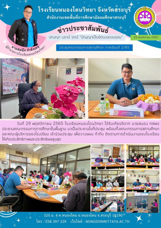 วันที่ 29 พฤศจิกายน 2565 โรงเรียนหนองโดนวิทยา ได้รับเกียรติจาก นายสนอง ทศพร ประธานคณะกรรมการการศึกษาขั้นพื้นฐาน มาเป็นประธานในที่ประชุม พร้อมทั้งคณะกรรมการสถานศึกษา และคณะผู้บริหารของโรงเรียน เข้าร่วมประชุม เพื่อวางแผน กำกับ ติดตามการดำเนินงานของโรงเรียน