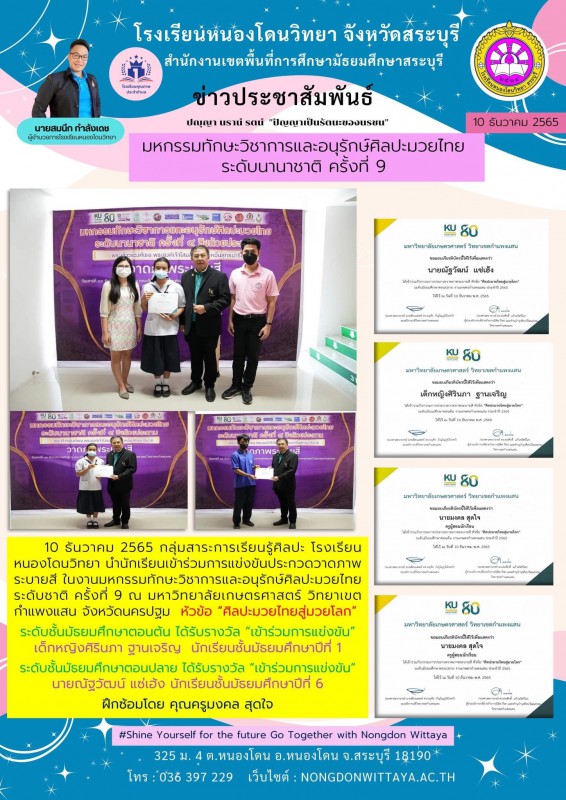 วันที่ 10 ธันวาคม 2565 กลุ่มสาระการเรียนรู้ศิลปะ โรงเรียนหนองโดนวิทยา นำนักเรียนเข้าร่วมการแข่งขันประกวดวาดภาพระบายสีในงานมหกรรมทักษะวิชาการและอนุรักษ์ศิลปะมวยไทยระดับชาติ ครั้งที่ 9 ณ มหาวิทยาลัยเกษตรศาสตร์ วิทยาเขตกำแพงแสน จังหวัด นครปฐม