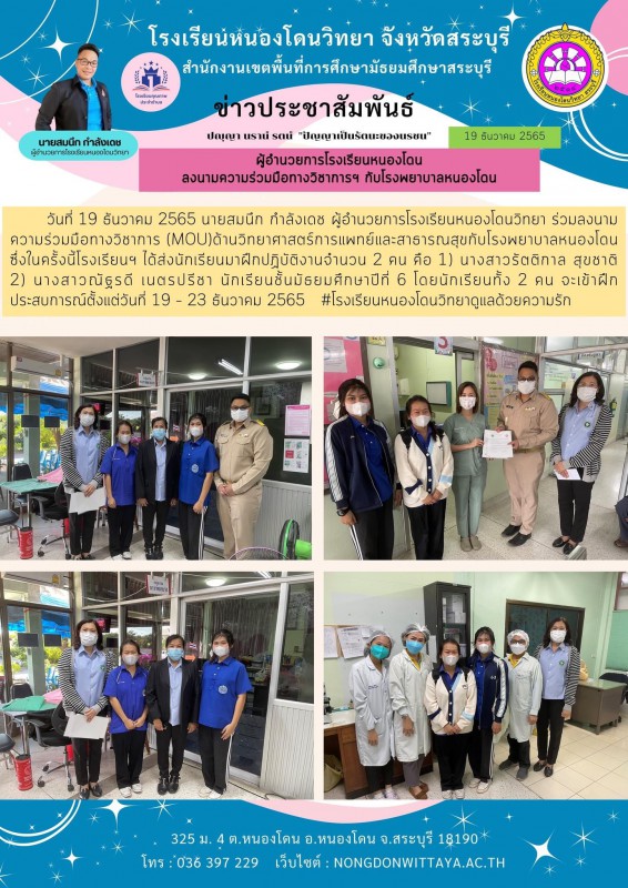 วันที่ 19 ธันวาคม 2565 นายสมนึก กำลังเดช ผู้อำนวยการโรงเรียนหนองโดนวิทยา ร่วมลงนามความร่วมมือทางวิชาการ (MOU)ด้านวิทยาศาสตร์การแพทย์และสาธารณสุขกับโรงพยาบาลหนองโดน