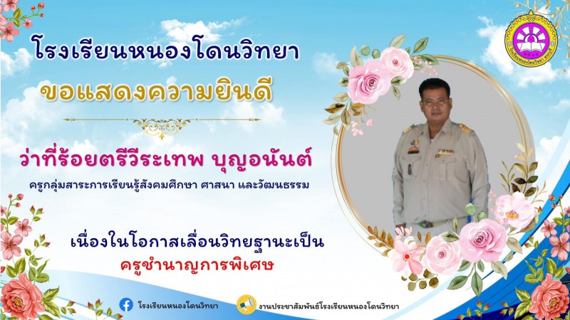 โรงเรียนหนองโดนวิทยาขอแสดงความยินดีแก่ ว่าที่ร้อยตรีวีระเทพ บุญอนันต์ ครูกลุ่มสาระการเรียนรู้สังคมศึกษา ศาสนา และวัฒนธรรม ในโอกาสเลื่อนวิทยฐานะเป็น “ชำนาญการพิเศษ”