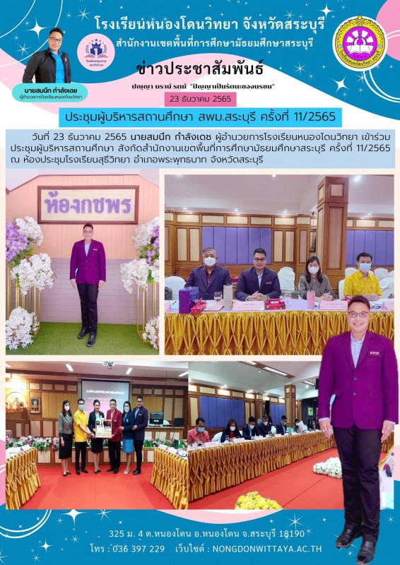 วันที่ 23 ธันวาคม 2565 นายสมนึก กำลังเดช ผู้อำนวยการโรงเรียนหนองโดนวิทยา เข้าร่วมประชุมผู้บริหารสถานศึกษา สังกัดสำนักงานเขตพื้นที่การศึกษามัธยมศึกษาสระบุรี ครั้งที่ 11/2565 ณ ห้องประชุมโรงเรียนสุธีวิทยา อำเภอพระพุทธบาท จังหวัดสระบุรี