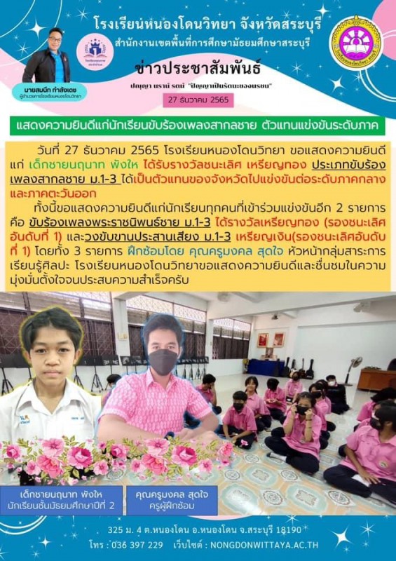 วันที่ 27 ธันวาคม 2565 โรงเรียนหนองโดนวิทยา ขอแสดงความยินดีแก่ เด็กชายนฤนาท พังให ได้รับรางวัลชนะเลิศ เหรียญทอง ประเภทขับร้องเพลงสากลชาย ม.1-3 ได้เป็นตัวแทนของจังหวัดไปแข่งขันต่อระดับภาคกลางและภาคตะวันออก