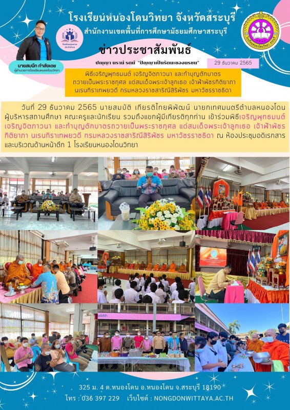 วันที่ 29 ธันวาคม 2565 โรงเรียนหนองโดนวิทยาจัดพิธีเจริญพุทธมนต์ เจริญจิตภาวนา และทำบุญตักบาตรถวายเป็นพระราชกุศล แด่สมเด็จพระเจ้าลูกเธอ เจ้าฟ้าพัชรกิติยาภา นเรนทิราเทพยวดี กรมหลวงราชสาริณีสิริพัชร มหาวัชรราชธิดา ณ โรงเรียนหนองโดนวิทยา