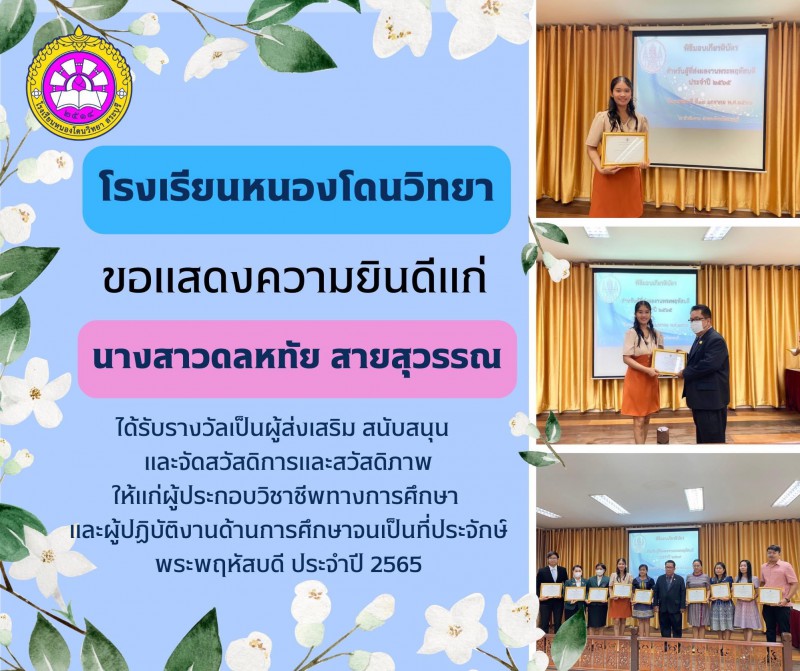 19 มกราคม 2566 โรงเรียนหนองโดนวิทยา ขอแสดงความยินดีแก่ นางสาวดลหทัย สายสุวรรณ ได้รับรางวัลเป็นผู้ส่งเสริม สนับสนุน และจัดสวัสดิภาพให้แก่ผู้ประกอบวิชาชีพทางการศึกษา และผู้ปฏิบัติงานด้านการศึกษาจนเป็นที่ประจักษ์ พระพฤหัสบดี ประจำปี 2565