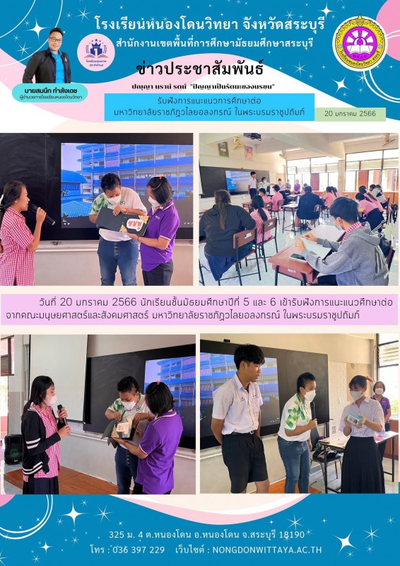 วันที่ 20 มกราคม 2566 นักเรียนชั้นมัธยมศึกษาปีที่ 5 และ 6 เข้ารับฟังการแนะแนวศึกษาต่อ จากคณะมนุษยศาสตร์และสังคมศาสตร์ มหาวิทยาลัยราชภัฏวไลยอลงกรณ์ ในพระบรมราชูปถัมภ์