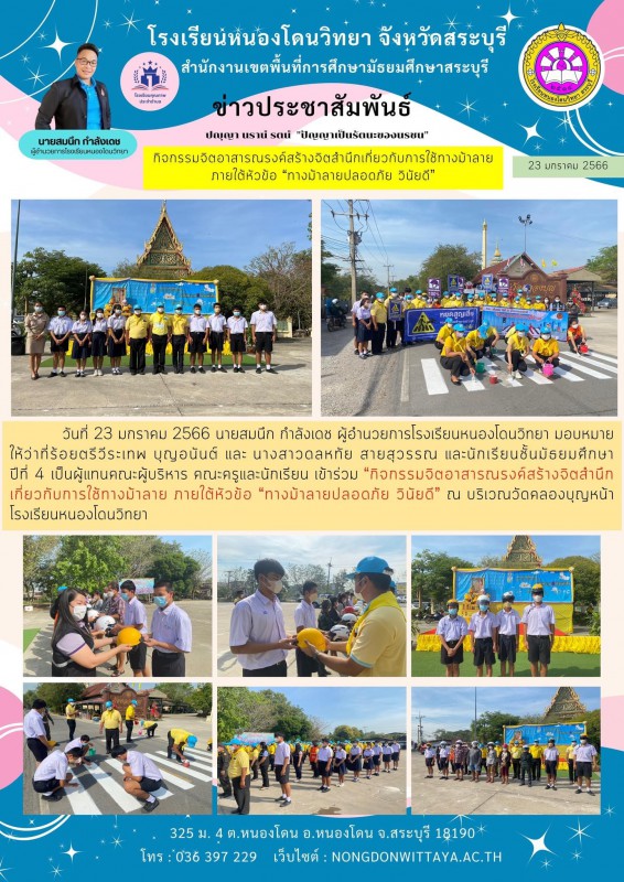 วันที่ 23 มกราคม 2566 ว่าที่ร้อยตรีวีระเทพ บุญอนันต์ และ นางสาวดลหทัย สายสุวรรณ และนักเรียนชั้นมัธยมศึกษาปีที่ 4 เข้าร่วม “กิจกรรมจิตอาสารณรงค์สร้างจิตสำนึกเกี่ยวกับการใช้ทางม้าลาย ภายใต้หัวข้อ “ทางม้าลายปลอดภัย วินัยดี” ณ บริเวณวัดคลองบุญหน้าโรงเรียนหนอง