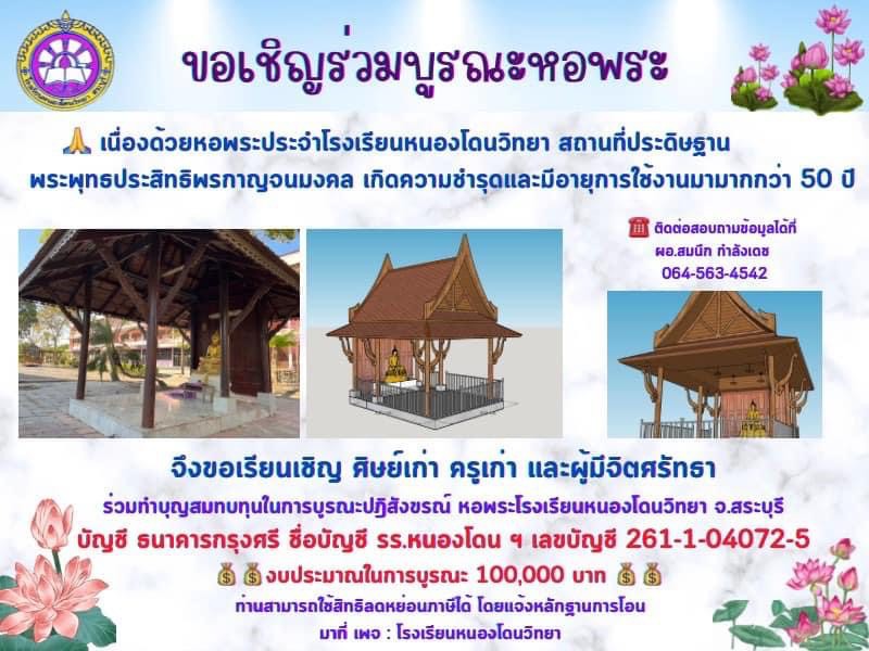 โรงเรียนหนองโดนวิทยาขอเรียนเชิญศิษย์เก่า ครูเก่า หรือผู้ที่สนใจ ร่วมเป็นส่วนหนึ่งการบูรณะหอพระพุทธประสิทธิพรกาญจนมงคล