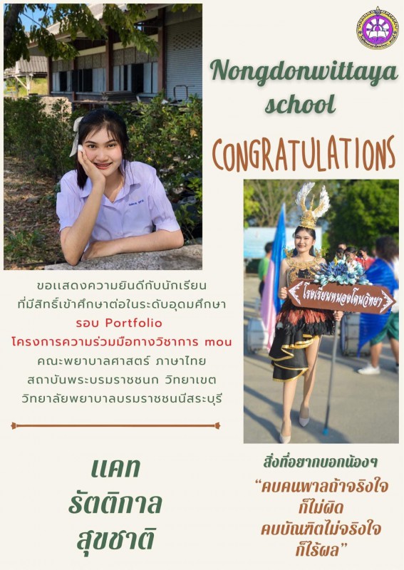 โรงเรียนหนองโดนวิทยาขอแสดงความยินดีแก่นางสาว รัตติกาล สุขชาติ (พี่แคท) ได้รับคัดเลือกเข้าศึกษาต่อในโครงการความร่วมมือทางวิชาการ (MOU) คณะพยาบาลศาสตร์ สถาบันพระบรมราชชนก วิทยาลัยพยาบาลบรมราชชนนีวิทยาเขตสระบุรี