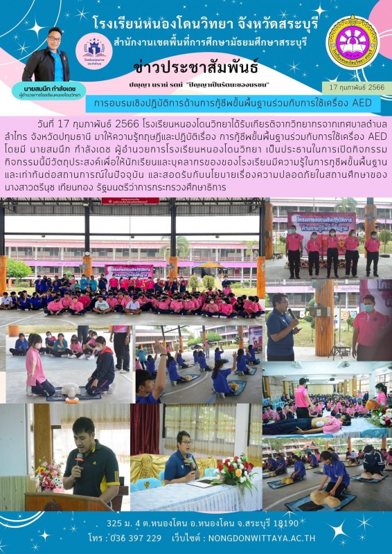 วันที่ 17 กุมภาพันธ์ 2566 โรงเรียนหนองโดนวิทยาได้รับเกียรติจากวิทยากรจากเทศบาลตำบลลำไทร จังหวัดปทุมธานี มาให้ความรู้ทฤษฎีและปฏิบัติเรื่อง การกู้ชีพขั้นพื้นฐานร่วมกับการใช้เครื่อง AED