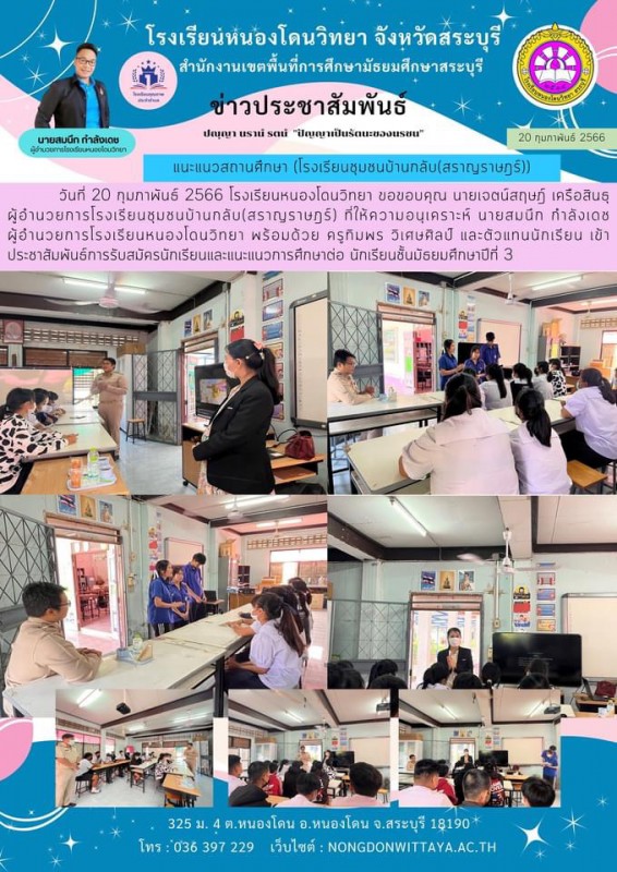 วันที่ 20 กุมภาพันธ์ 2566 โรงเรียนหนองโดนวิทยา เข้าประชาสัมพันธ์การรับสมัครนักเรียนและแนะแนวการศึกษาต่อ นักเรียนชั้นประถมศึกษาปีที่ 6 ณ โรงเรียนชุมชนบ้านกลับ(สราญราษฎร์)