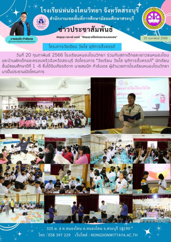 วันที่ 20 กุมภาพันธ์ 2566 โรงเรียนหนองโดนวิทยา ร่วมกับสภาเด็กและเยาวชนหนองโดน และบ้านพักเด็กและครอบครัวจังหวัดสระบุรี จัดโครงการ “วัยเรียน วัยใส ยุติการตั้งครรภ์” นักเรียนชั้นมัธยมศึกษาปีที่ 1 –6