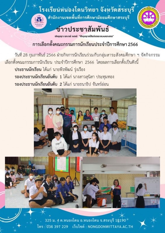 วันที่ 28 กุมภาพันธ์ 2566 ฝ่ายกิจการนักเรียนร่วมกับกลุ่มสาระสังคมศึกษา ฯ จัดกิจกรรมเลือกตั้งคณะกรรมการนักเรียน ประจำปีการศึกษา 2566