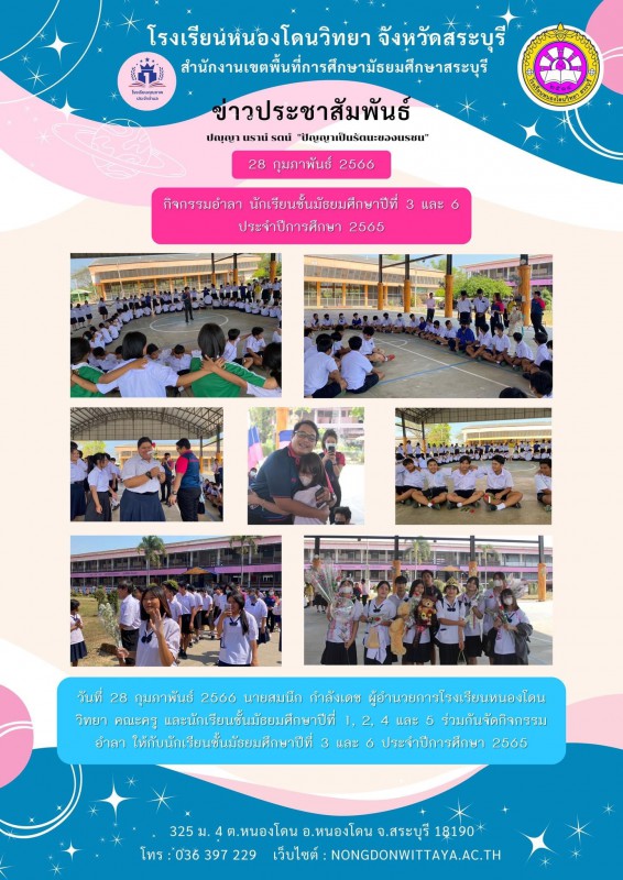 วันที่ 28 กุมภาพันธ์ 2566 โรงเรียนหนองโดนวิทยา โดยนายสมนึก กำลังเดช ผู้อำนวยการโรงเรียนหนองโดนวิทยา คณะครู และนักเรียนชั้นมัธยมศึกษาปีที่ 1, 2, 4 และ 5 ได้จัดกิจกรรมอำลา ให้แก่นักเรียนชั้นมธยมศึกษาปีที่ 3 และ 6 ที่จบการศึกษาในปีการศึกษา 2565