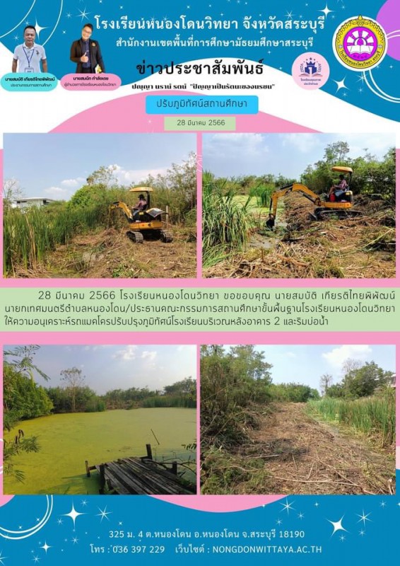 28 มีนาคม 2566 โรงเรียนหนองโดนวิทยา ขอขอบคุณ นายสมบัติ เกียรติไทยพิพัฒน์ นายกเทศมนตรีตำบลหนองโดน/ประธานคณะกรรมการสถานศึกษาขั้นพื้นฐานโรงเรียนหนองโดนวิทยา ให้ความอนุเคราะห์รถแมคโครปรับปรุงภูมิทัศน์โรงเรียนบริเวณหลังอาคาร 2 และริมบ่อน้ำ