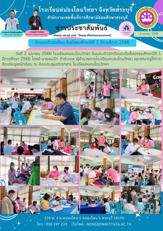 วันที่ 2 เมษายน 2566 โรงเรียนหนองโดนวิทยา รับมอบตัวนักเรียนระดับชั้นมัธยมศึกษาปีที่ 1 ปีการศึกษา 2566 โดยมี นายสมนึก กำลังเดช ผู้อำนวยการโรงเรียนหนองโดนวิทยา และคณะครูให้การต้อนรับดูแลนักเรียน