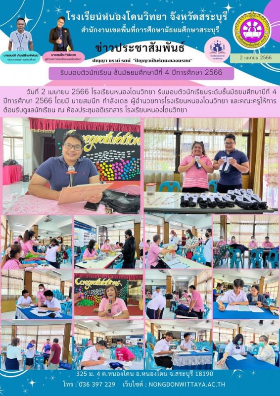 วันที่ 2 เมษายน 2566 โรงเรียนหนองโดนวิทยา รับมอบตัวนักเรียนระดับชั้นมัธยมศึกษาปีที่ 4 ปีการศึกษา 2566 โดยมี นายสมนึก กำลังเดช ผู้อำนวยการโรงเรียนหนองโดนวิทยา และคณะครูให้การต้อนรับดูแลนักเรียน