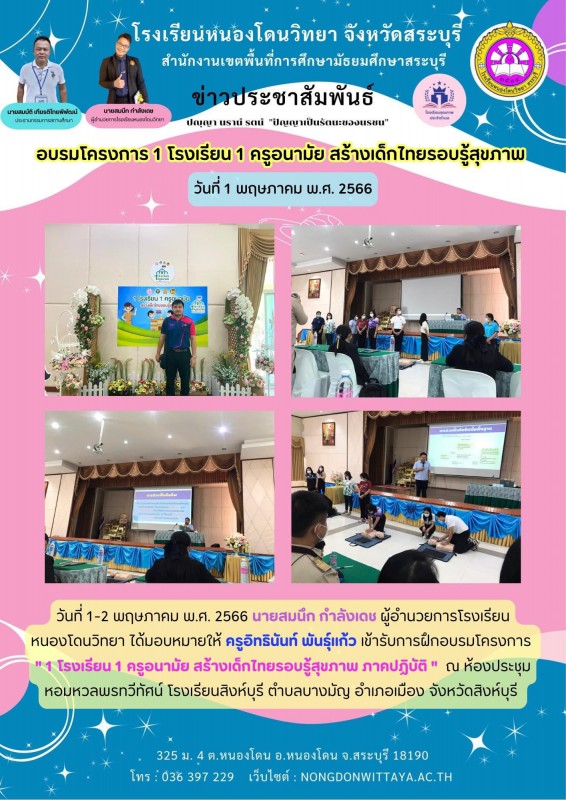 วันที่ 1 พฤษภาคม 2566 ครูอิทธินันท์ พันธ์ุแก้ว เข้ารับการฝึกอบรมโครงการ "1 โรงเรียน 1 ครูอนามัย สร้างเด็กไทยรอบรู้สุขภาพ ภาคปฏิบัติ" ระหว่างวันที่ 1-2 พฤษภาคม 2566 ณ ห้องประชุมหอมหวลพรทวีทัศน์ โรงเรียนสิงห์บุรี ตำบลบางมัญ อำเภอเมือง จังหวัดสิงห์บุรี