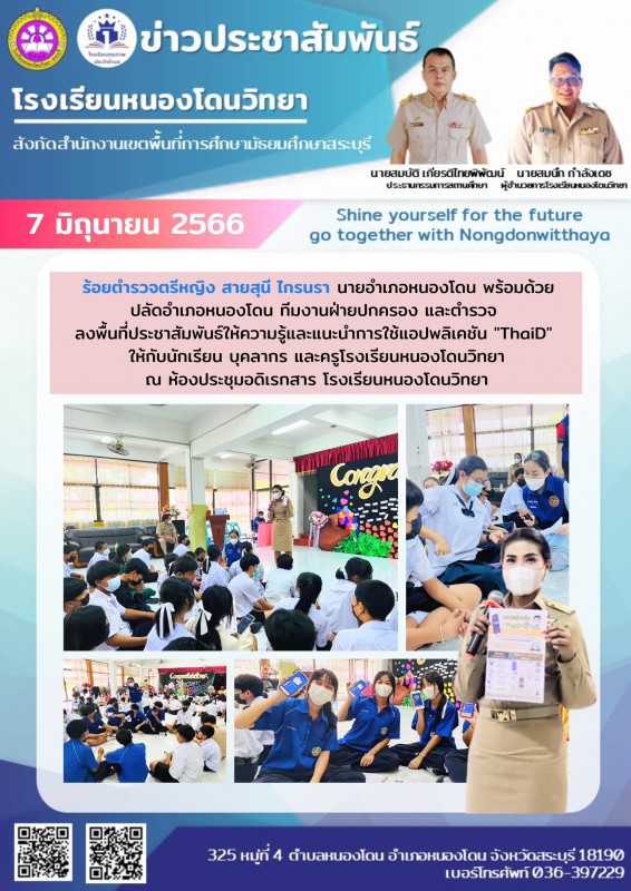 วันที่ 7 มิถุนายน 2566 ร้อยตำรวจตรีหญิง สายสุนี ไกรนรา นายอำเภอหนองโดน พร้อมด้วยปลัดอำเภอหนองโดน ทีมงานฝ่ายปกครอง และตำรวจ ลงพื้นที่ประชาสัมพันธ์ให้ความรู้และแนะนำการใช้แอปพลิเคชัน "ThaiD" ให้กับนักเรียน บุคลากร และครูโรงเรียนหนองโดนวิทยา