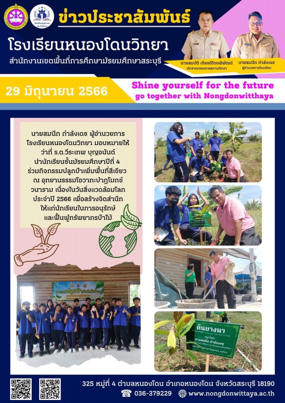 วันที่ 29 มิถุนายน 2566 นายสมนึก กำลังเดช ผู้อำนวยการโรงเรียนหนองโดนวิทยา มอบหมายให้ ว่าที่ ร.ต.วีระเทพ บุญอนันต์ นำนักเรียนชั้นมัธยมศึกษาปีที่ 4 ร่วมกิจกรรมปลูกป่าเพิ่มพื้นที่สีเขียว ณ อุทยานธรรมโอวาทะปาฏโมกข์วนาราม เนื่องในวันสิ่งแวดล้อมโลก ประจำปี 2566