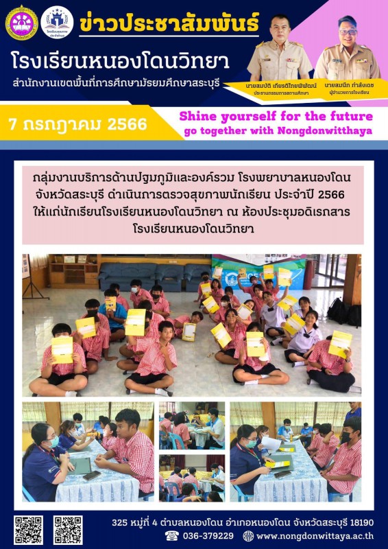 วันที่ 7 กรกฎาคม 2566 กลุ่มงานบริการด้านปฐมภูมิและองค์รวม โรงพยาบาลหนองโดน จังหวัดสระบุรี ดำเนินการตรวจสุขภาพนักเรียน ประจำปี 2566 ให้แก่นักเรียนโรงเรียนหนองโดนวิทยา ณ ห้องประชุมอดิเรกสาร โรงเรียนหนองโดนวิทยา