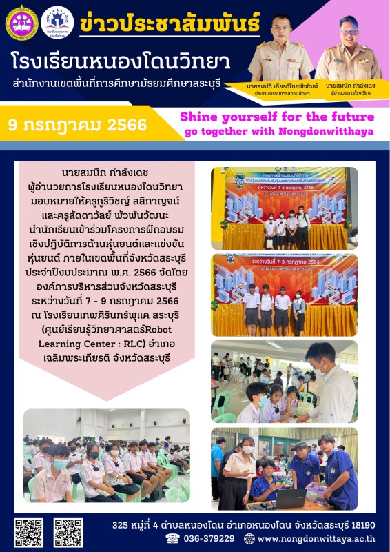 วันที่ 9 กรกฎาคม 2566 ครูภูริวิชญ์ สสิกาญจน์ และครูลัดดาวัลย์ พัวพันวัฒนะ นำนักเรียนเข้าร่วมโครงการฝึกอบรมเชิงปฏิบัติการด้านหุ่นยนต์และแข่งขันหุ่นยนต์ ภายในเขตพื้นที่จังหวัดสระบุรี ระหว่างวันที่ 7 - 9 กรกฎาคม 2566 ณ โรงเรียนเทพศิรินทร์พุแค สระบุรี