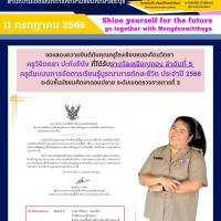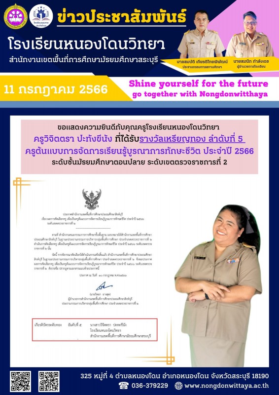 วันที่ 11 กรกฎาคม 2566 ขอแสดงความยินดีกับ ครูวิจิตตรา ปะทะขีนัง ที่ได้รับรางวัลเกียรติบัตรเหรียญทองอันดับที่ 5 ระดับเขตตรวจราชการที่ 2 ครูต้นแบบการจัดการเรียนการสอนบูรณาการทักษะชีวิต ประจำปี 2566 ระดับชั้นมัธยมศึกษาปีที่ 4-6