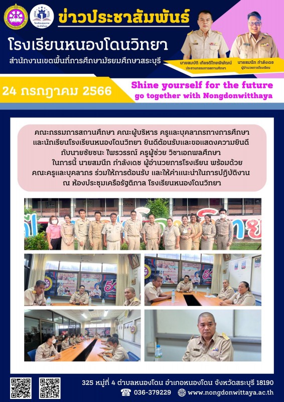 วันที่ 24 กรกฎาคม 2566 คณะกรรมการสถานศึกษา คณะผู้บริหาร ครูและบุคลากรทางการศึกษาและนักเรียนโรงเรียนหนองโดนวิทยา ยินดีต้อนรับและขอแสดงความยินดี กับนายชัยชนะ ไพรวรรณ์ ครูผู้ช่วย วิชาเอกพลศึกษา โรงเรียนหนองโดนวิทยา