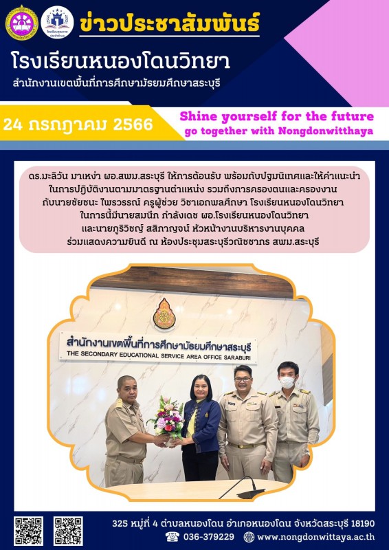 วันที่ 24 กรกฎาคม 2566 ดร.มะลิวัน มาเหง่า ผอ.สพม.สระบุรี ให้การต้อนรับ พร้อมกับปฐมนิเทศและให้คำแนะนำในการปฎิบัติงานตามมาตรฐานตำแหน่ง รวมถึงการครองตนและครองงาน กับนายชัยชนะ ไพรวรรณ์ ครูผู้ช่วย วิชาเอกพลศึกษา โรงเรียนหนองโดนวิทยา