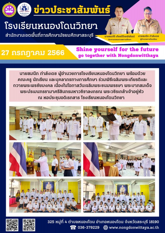 วันที่ 27 กรกฎาคม 2566 นายสมนึก กำลังเดช ผู้อำนวยการโรงเรียนหนองโดนวิทยา พร้อมด้วยคณะครู นักเรียน และบุคลากรทางการศึกษา ร่วมพิธีเฉลิมพระเกียรติและถวายพระพรชัยมงคล เนื่องในโอกาสวันเฉลิมพระชนมพรรษา รัชกาลที่ 10 ณ หอประชุมอดิเรกสาร โรงเรียนหนองโดนวิทยา