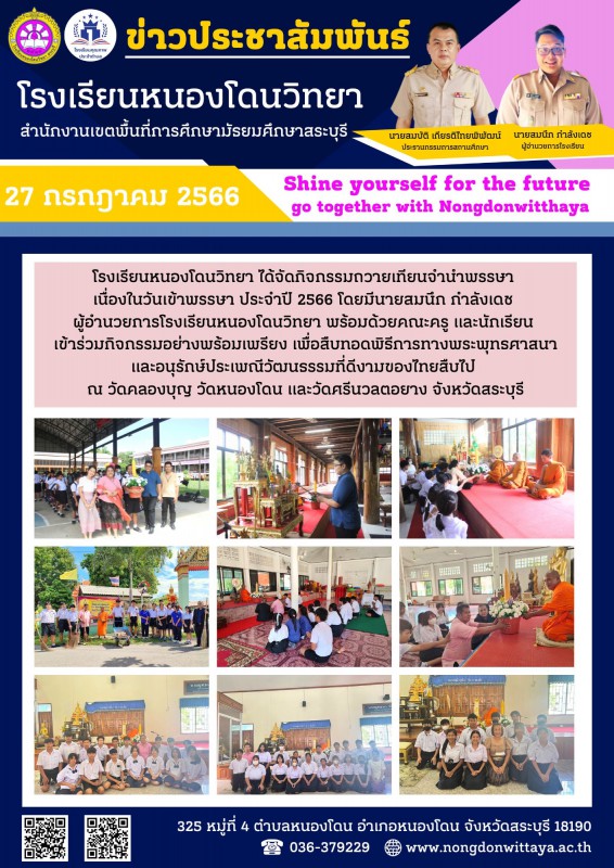 วันที่ 27 กรกฎาคม 2566 โรงเรียนหนองโดนวิทยา ได้จัดกิจกรรมถวายเทียนจำนำพรรษา เนื่องในวันเข้าพรรษา ประจำปี 2566 เพื่อสืบทอดพิธีการทางพระพุทธศาสนาและอนุรักษ์ประเพณีวัฒนธรรมที่ดีงามของไทยสืบไป ณ วัดคลองบุญ วัดหนองโดน และวัดศรีนวลตอยาง จังหวัดสระบุรี