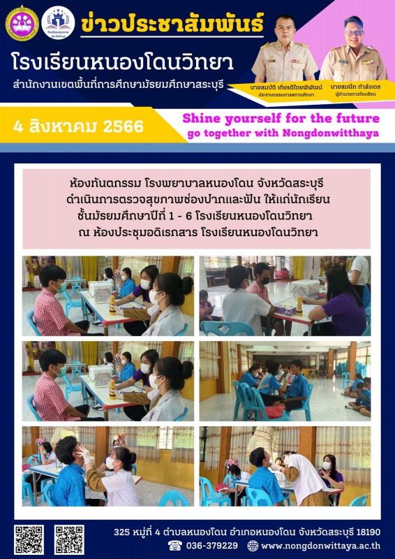 วันที่ 4 สิงหาคม 2566 ห้องทันตกรรม โรงพยาบาลหนองโดน จังหวัดสระบุรี ดำเนินการตรวจสุขภาพช่องปากและฟัน ให้แก่นักเรียนชั้นมัธยมศึกษาปีที่ 1 - 6 โรงเรียนหนองโดนวิทยา ณ ห้องประชุมอดิเรกสาร โรงเรียนหนองโดนวิทยา