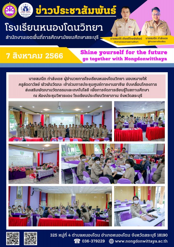 วันที่ 7 สิงหาคม 2566 ครูลัดดาวัลย์ พัวพันวัฒนะ เข้าร่วมการประชุมศูนย์การงานอาชีพ ขับเคลื่อนโครงการส่งเสริมพัฒนานวัตกรรมและเทคโนโลยี เพื่อการจัดการเรียนรู้ในสถานศึกษา ณ ห้องประชุมวิหารแดง โรงเรียนประเทียบวิทยาทาน จังหวัดสระบุรี