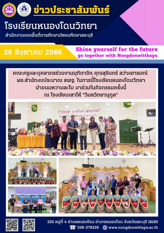 วันที่ 26 สิงหาคม 2566 คณะครูและบุคลากรร่วมงานมุทิตาจิต คุณสุรินทร์ สว่างอารมณ์ ผอ.สำนักงบประมาณ สพฐ. ในการนี้ โรงเรียนหนองโดนวิทยานำขนมหวานละไม มาร่วมในกิจกรรมครั้งนี้ ณ โรงเรียนเสาไห้ "วิมลวิทยานุกูล"