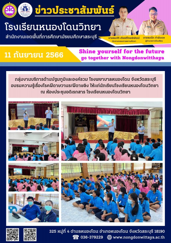 วันที่ 11 กันยายน 2566 กลุ่มงานบริการด้านปฐมภูมิและองค์รวม โรงพยาบาลหนองโดน จังหวัดสระบุรี อบรมความรู้เรื่องโรคฝีดาษวานร/ฝีดาษลิง ให้แก่นักเรียนโรงเรียนหนองโดนวิทยา ณ ห้องประชุมอดิเรกสาร โรงเรียนหนองโดนวิทยา